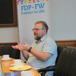 Zuerst stellten Arne Hermann Stopsack und Guido Schneider das Aufgabenspektrum und die Strukturen des LWL vor: Der Verband übernimmt mit seinen mehr als 19.000 Beschäftigten viele kommunale Aufgaben für die 8,5 Millionen Menschen in Westfalen. Der LWL betreibt 35 Förderschulen, 21 Krankenhäuser, 18 Museen, zwei Besucherzentren und ist der zweitgrößte deutsche Hilfezahler für Menschen mit Behinderung. Er erfüllt damit Aufgaben im sozialen Bereich, in der Behinderten- und Jugendhilfe, in der Psychiatrie und in der Kultur. Alles Aufgaben, für die auch ein starker Kreis wie Siegen-Wittgenstein allein zu klein wäre. Die neun kreisfreien Städte und 18 Kreise in Westfalen-Lippe sind die Mitglieder des LWL. Sie tragen und finanzieren den Landschaftsverband, dessen Aufgaben ein Parlament mit 125 Mitgliedern aus den westfälischen Kommunen gestaltet, von denen 10 der Fraktion von Freien Demokraten und Freien Wählern angehören. Die Aufwendungen des LWL betragen 2023 immerhin 4 Milliarden Euro an kommunalen Geldern und noch weitere 4 Milliarden Euro aus den Haushalten von Bund und Land, zum Beispiel in der Kinder- und Jugendhilfe und dem Psychiatrie-Verbund.