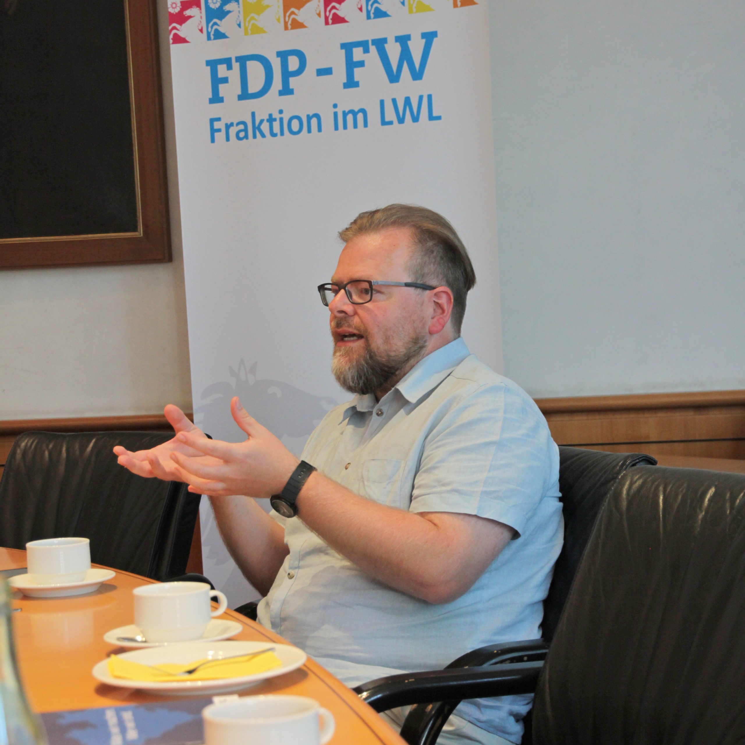 Der Fraktionsvorsitzende, Arne Hermann Stopsack, empfing die Kommunalpolitiker und Freunde der Freiheit im Ausschusszimmer zu einem ausführlichen Informationsgespräch und Gedankenaustausch. Dieser Besuch war von dem Sachkundigen Bürger Guido Schneider, Siegen-Wittgensteins Vertreter im Landschaftsverband, mit initiiert worden. Schneider ist in der FDP-FW-Fraktion vor allem im Bereich Schule und Jugend tätig und vertritt die Freien Demokraten im Landesjugendhilfeausschuss.