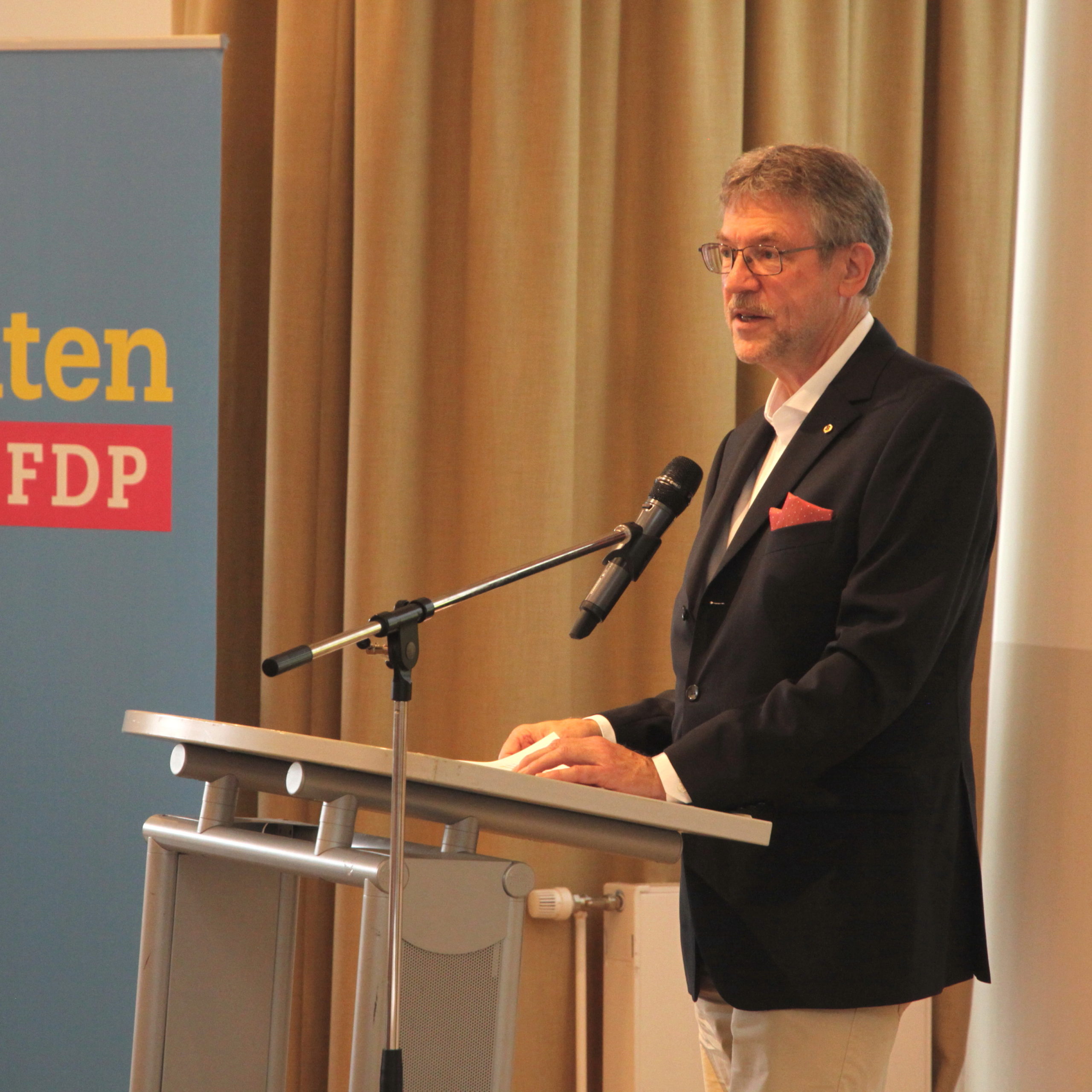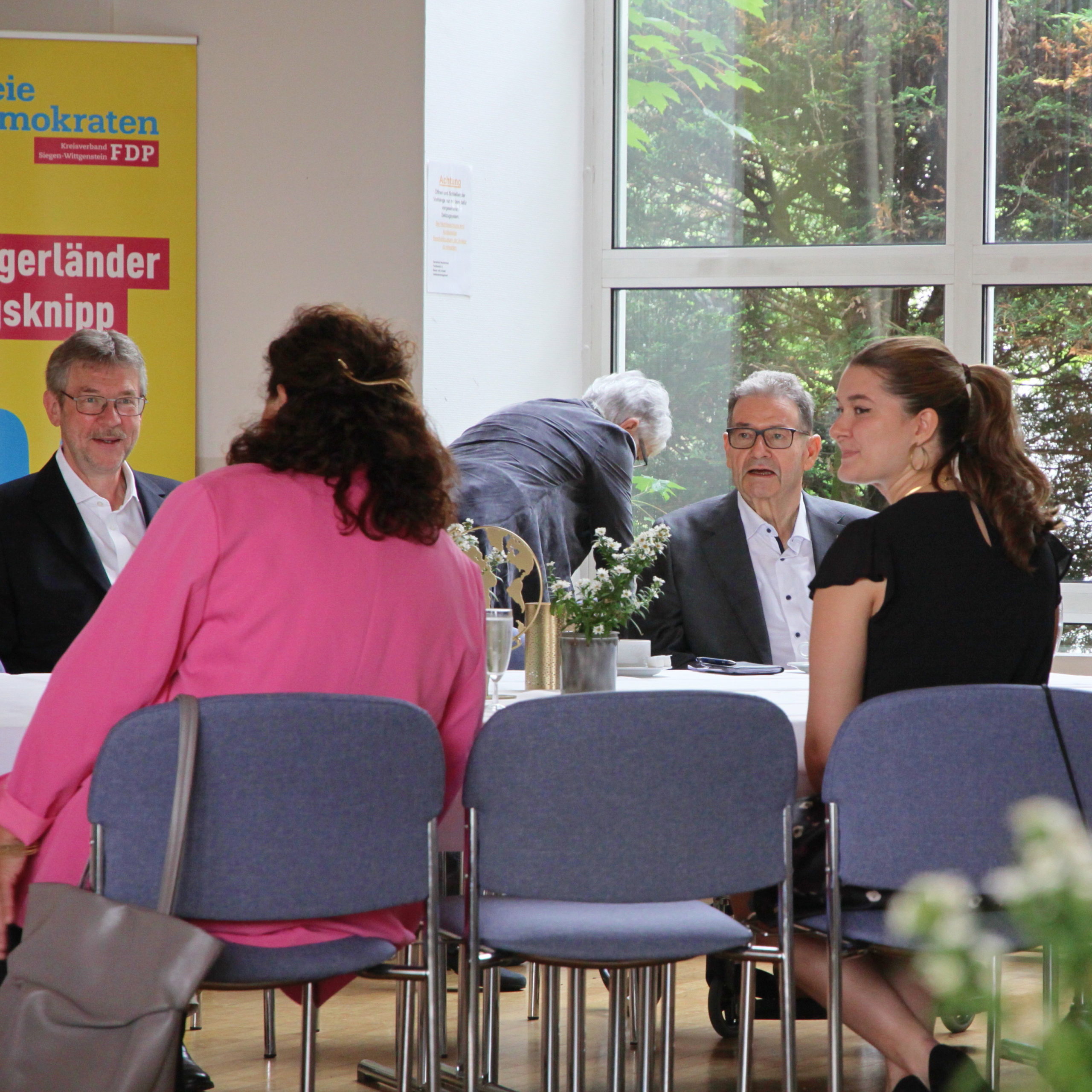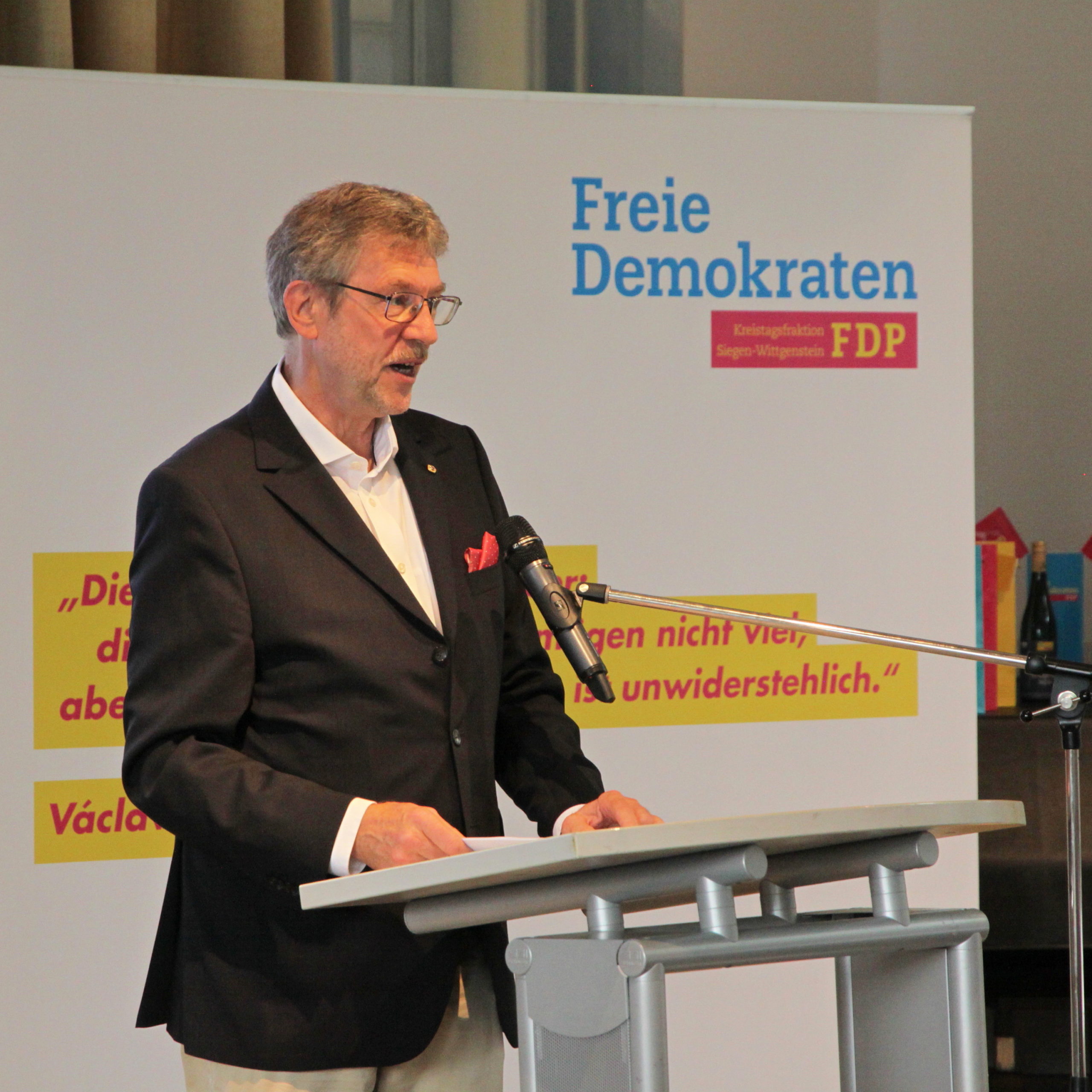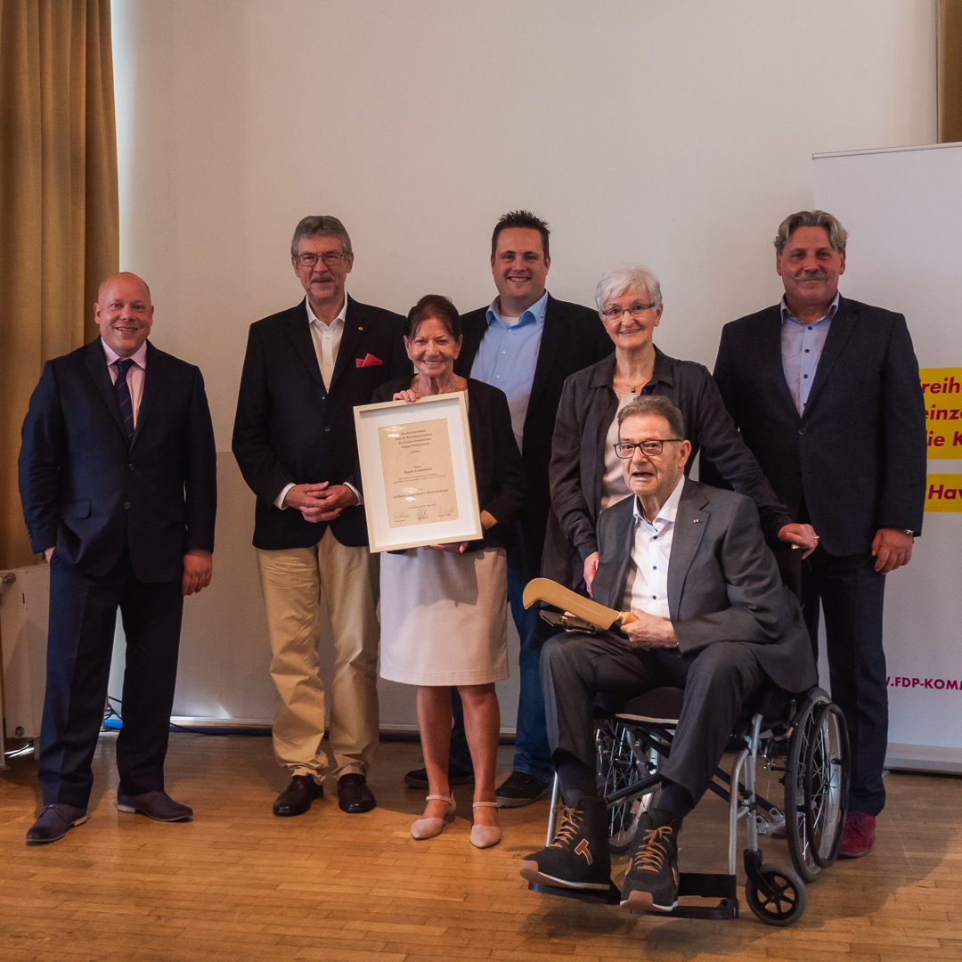 Zur Überraschung aller reihte sich ein dritter Laudator ein. Der Parteichef und Finanzminister Christian Lindner sendete eine Videobotschaft aus dem fernen Berlin. Er wäre auch gerne selbst gekommen, aber die aktuellen Diskussionen zum Haushalt und das ZDF-Sommerinterview ließen eine Teilnahme nicht zu. Beide kennen sich seit der Jahrtausendwende gut. „Insbesondere ist mir in Erinnerung, dass Sie auch in den schwierigen Zeiten unseres nordrheinwestfälischen Landesverbandes immer zur Stelle waren“, betonte der Bundesfinanzminister. „Ganz besonders gerne erinnere ich mich daran zurück, wie wir beide in der Programmkommission 2004/2005 das – übrigens erfolgreiche – Wahlprogramm für die Landtagswahl 2005 geschrieben haben und vieles davon zwischen 2005 und 2010 umsetzen konnten“. Für den Bundesvorsitzenden der Liberalen ist der Ehrenpreis eine „berechtigte Auszeichnung für das politische Lebenswerk“ von Hagen Tschoeltsch, dem er „ganz großen Respekt“ zollte und das mit einem „Dank der Freien Demokraten insgesamt, für das, was Sie bewegt haben“ verband. Zugleich hofft Lindner auch weiterhin darauf, dass wir Liberalen „auf Ihren Rat zählen können“.
