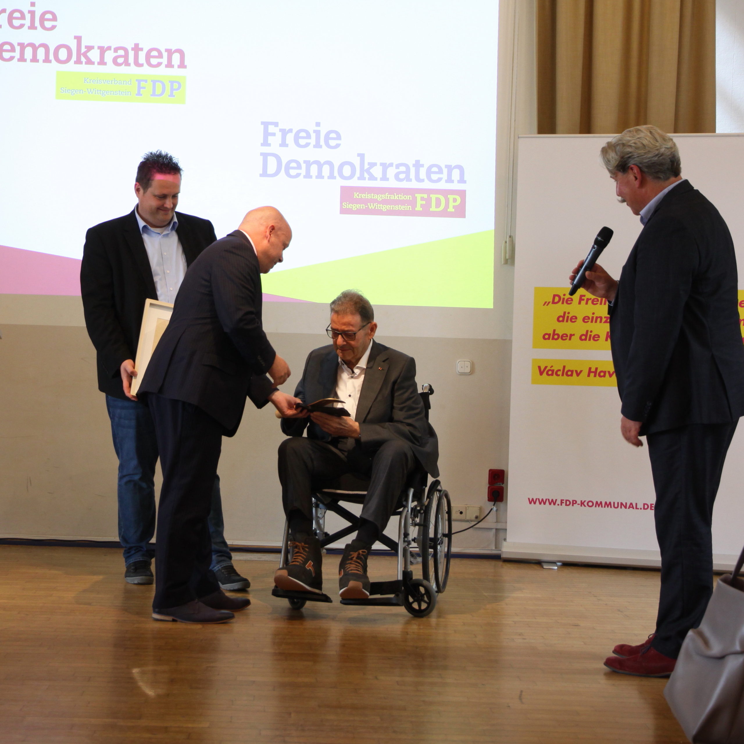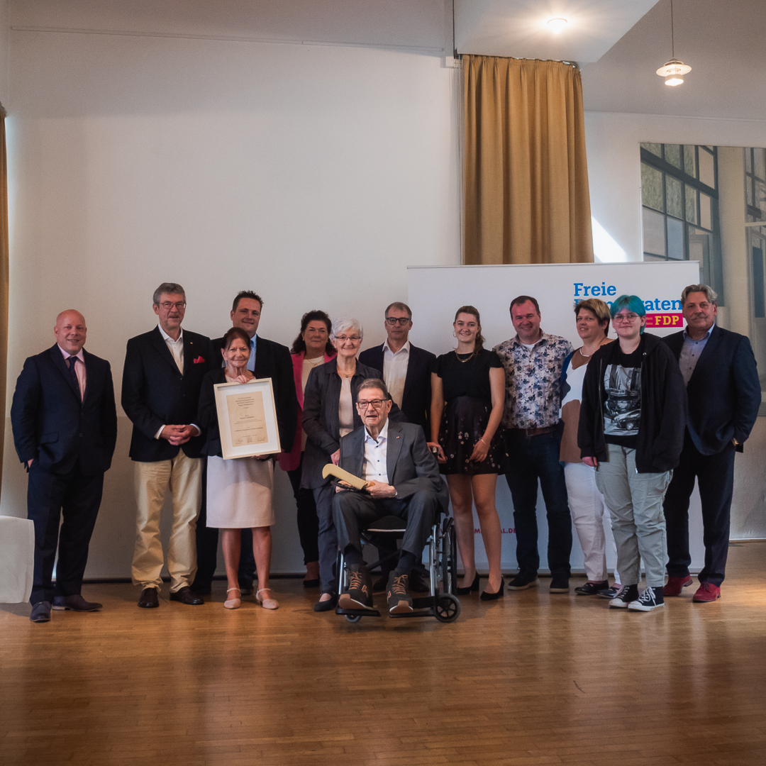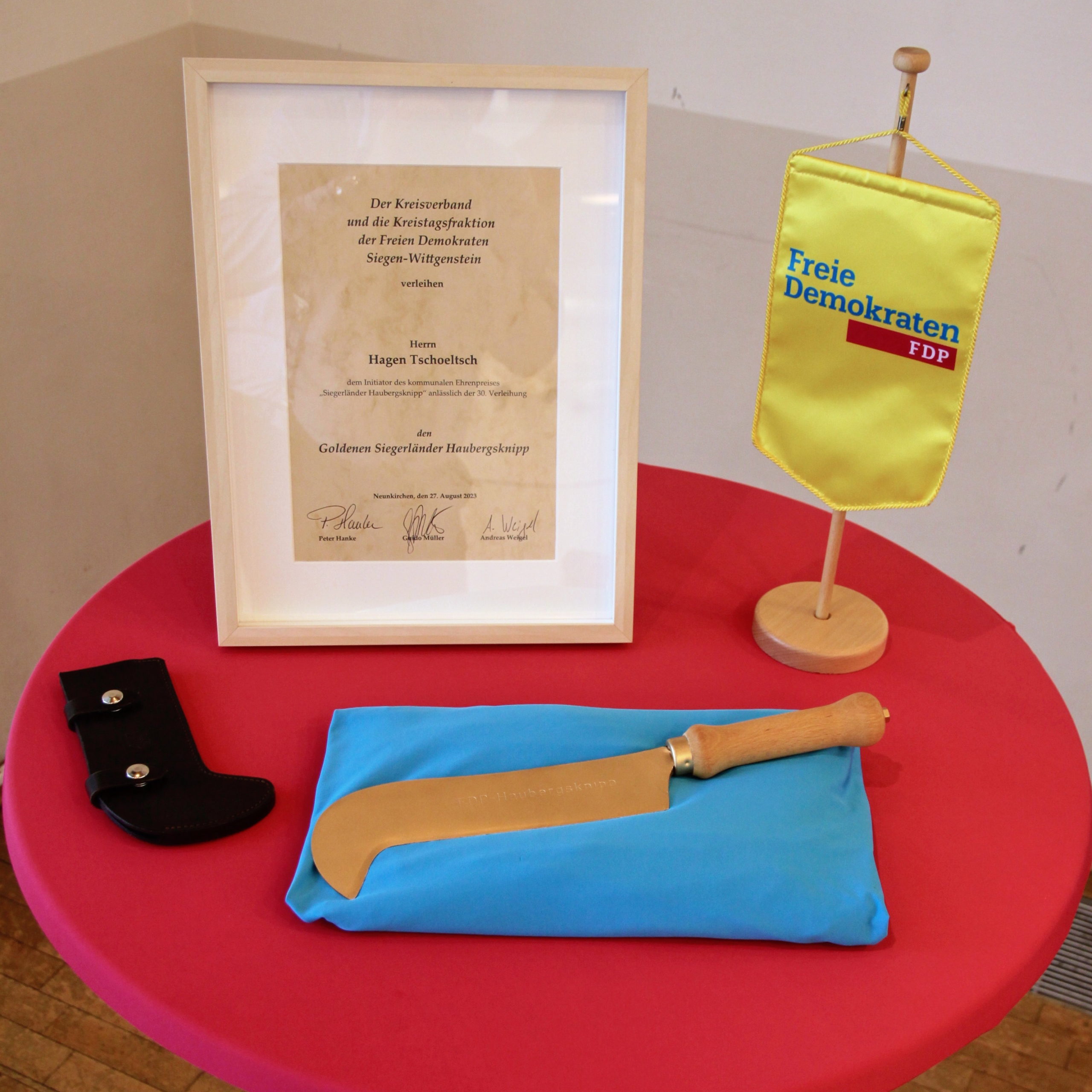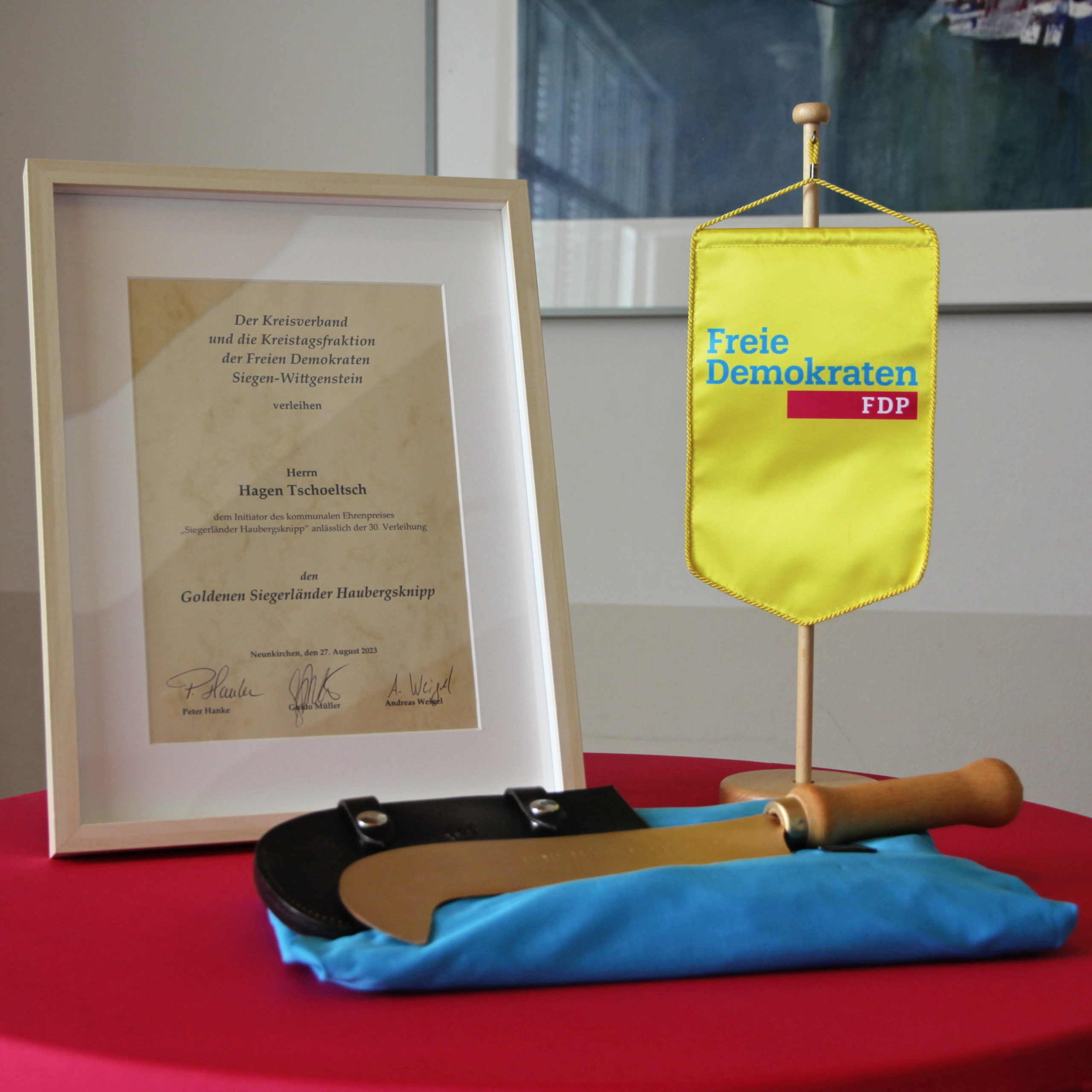 Am Wochenende verliehen der FDP Kreisverband und die FDP Kreistagsfraktion Siegen-Wittgenstein den diesjährigen kommunalen Ehrenpreis „Siegerländer Haubergsknipp“. Seit 30 Jahren gibt es diese Auszeichnung schon und sie wird traditionell an Institutionen und Persönlichkeiten vergeben, die sich um das Gemeinwohl in der heimischen Region verdient gemacht haben. Üblicherweise erhalten dabei je drei Preisträgerinnen bzw. Preisträger die Auszeichnung. Aufgrund des besonderen Jubiläums hat sich die Jury in diesem Jahr einstimmig dazu entschieden, mit dem Initiator des Ehrenpreises, dem Kreisehrenvorsitzenden und ehemaligen Landtagsabgeordneten Hagen Tschoeltsch, nur einen Preisträger auszuzeichnen und ihn mit einem ganz besonderen Ehrenpreis, dem ersten „Goldenen Haubergsknipp“, zu würdigen.