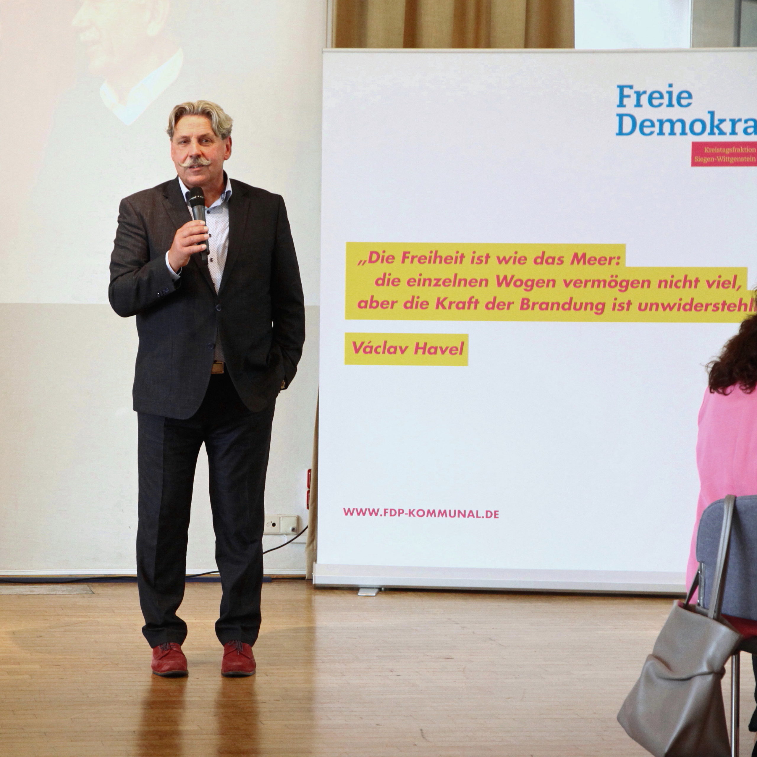 In seiner Replik bedankte sich Tschoeltsch bei „Initiatoren und Unterstützern, für die mir erteilte große Ehre“, ging aber aus gutem Grund auch selbst auf die „Hagen-Tschoeltsch-Stiftung“ ein. „Meine Frau Gudrun und ich haben in diesem Jahr die Geschicke der Stiftung maßgeblich in die Hände unserer Söhne Christian und Alexander übergeben. Wir denken, es ist der richtige Zeitpunkt.“ Die Stiftung ist ein gutes Beispiel für bürgerliches Engagement. Mehr als 160.000 € konnten so für Projekte zur Förderung von Wissenschaft, Bildung und Erziehung, Kunst und Kultur sowie für soziale Zwecke investiert werden. Dabei ist zu ergänzen, dass die Vergabe von besonderen Stipendien an Studenten vom Staat noch einmal in gleicher Höhe aufgestockt wird, sodass die Wirkung der Stiftungsgelder noch einmal erhöht wird. Doch Tschoeltsch wäre nicht Tschoeltsch, wenn er das nicht mit einem Appell verbinden würde: „Ich würde mir sehr wünschen, dass sich die Siegerländer und Wittgensteiner Unternehmerschaft auch durch die Gründung von eigenen Stiftungen stärker in die Gesellschaft einbrächte. Damit kann man selbst etwas bewegen und Dinge in die richtige Richtung lenken.“ Hagen Tschoeltsch unterstreicht damit die liberale Grundüberzeugung, dass eine starke Gesellschaft immer mehr leisten kann, als der Staat allein.